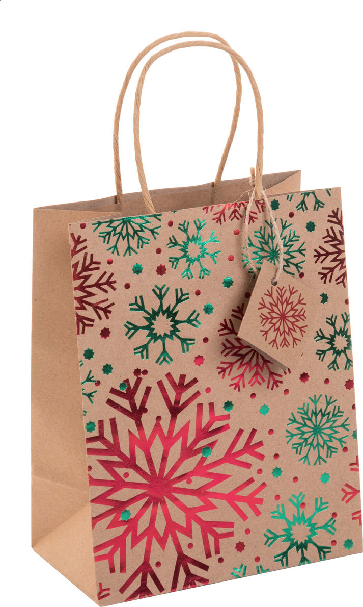 Dárková taška z recyklovaného kraftového papíru s vánočním designem vyraženým fólií, kroucenými uchy a dárkovou visačkou. 140 g/m².
