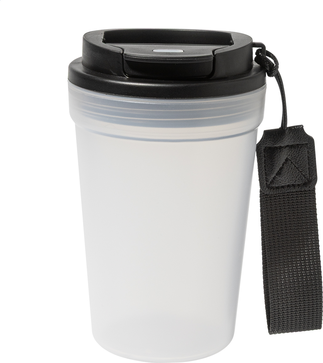 Jednostěnný cestovní kelímek z PP plastu s matnou povrchovou úpravou, víčkem na pití a poutkem z RPET polyesteru. 400 ml.