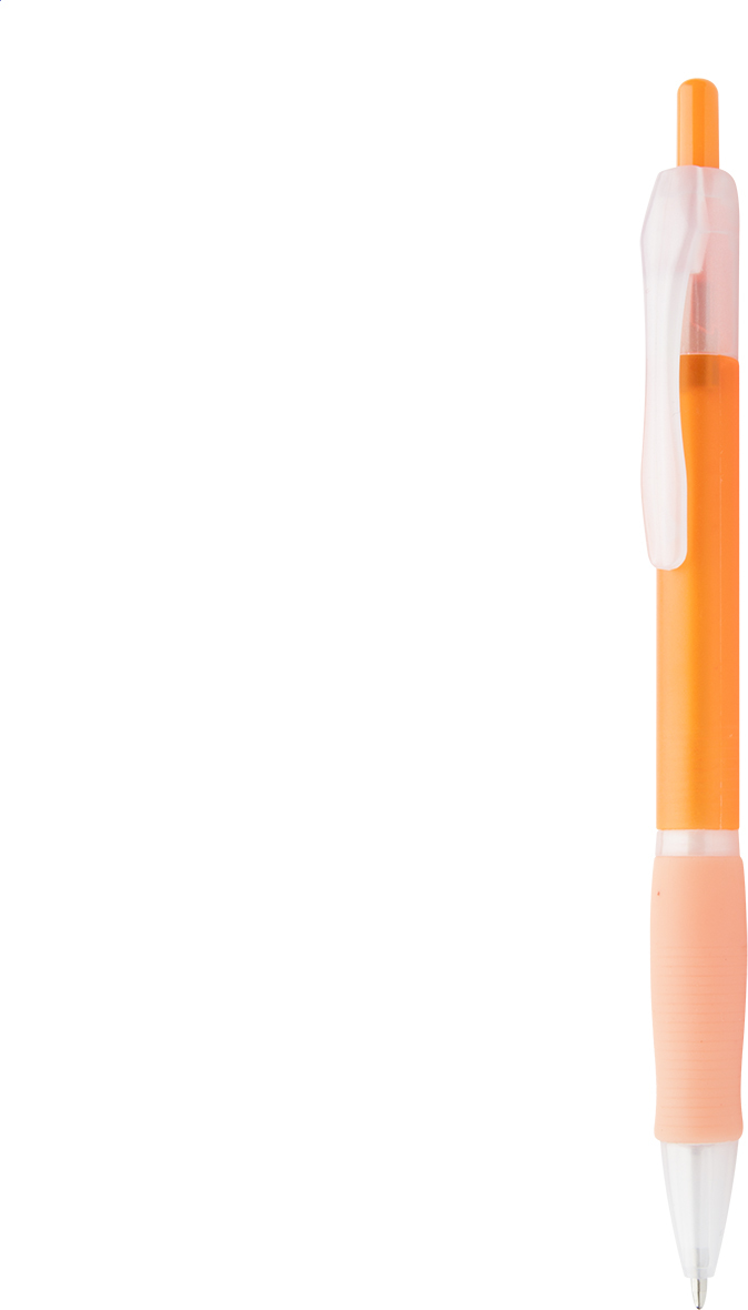 Plastové kuličkové pero s pogumovaným gripem a s modrou náplní.