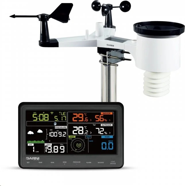 Wi-Fi meteorologická stanice s integrovaným bezdrátovým čidlem model GARNI 940 je vybavena mnoha funkcemi, zajišťujícími informace o předpovědi počasí. Integrované bezdrátové čidlo pracuje na frekvenci 868 MHz a měří teplotu a relativní vlhkost, rychlost a směr větru, úhrn srážek, UV záření a intenzitu osvětlení.Hlavní jednotka má snadno čitelný barevný inverzní displej, který zobrazuje předpověď počasí, vnitřní a venkovní teplotu a relativní vlhkost, hodnotu barometrického tlaku, srážek, rychlost a směr větru, UV index, hodnotu intenzity osvětlení, čas a datum, hodnotu rosného bodu, Wind Chill a teplotního indexu.Hlavní jednotka má paměť na minimální a maximální naměřené hodnoty a paměť na hodnoty barometrického tlaku naměřené za uplynulých 12, 24, 48 a 72 hodin. Je také možné nastavení různých alarmů. Čas a datum jsou automaticky seřízeny z internetu.Meteorologická stanice disponuje funkcí nahrávání naměřených hodnot na tyto internetové servery přes Wi-Fi: Weather Underground, Weathercloud, Weather Observations Website, Ecowitt. Pokročilým uživatelům nabízí možnost nahrávat naměřené hodnoty rovněž na jejich vlastní server nebo na server pocasi-meteo.cz. barevný inverzní LCD displej hlavní části o rozměrech 156 x 76 mm stálé osvětlení displeje s možností dvou stupňů jasu, nebo vypnutí osvětlenínapájení hlavní jednotky síťovým adaptérem (nutné pro přenos dat přes Wi-Fi) a baterieminastavení času z internetu, nebo manuálnězobrazení času ve 12ti, nebo 24 hodinovém formátu, datum se zkratkou názvu dne časová zóna (-12 až +12 hodin)budíkbarva na displeji: čas, rychlost a směr větru zelená, srážky modrá, vnitřní teplota a relativní vlhkost oranžová, UV index, intenzita osvětlení, barometrický tlak, venkovní teplota a relativní vlhkost bílávelikost číslic: čas 12 mm, datum 8mm, UV index 11 mm, intenzita osvětlení 11 mm, teplota a rel. vlhkost 14 mm, srážky 13 mm rychlost větru 5 mm, bar. tlak 8 mmikona příjmu signálu z integrovaného čidla ikona Wi-Fi připojenídotyková tlačítkazvukový signál stisku tlačítka s možností vypnutípředpověď počasí na 12 až 24 hodin (slunečno, polojasno, oblačno, déšť, sněžení)ikony fáze Měsíceintegrované bezdrátové čidlo pro měření vnější teploty a relativní vlhkosti, srážek, rychlosti a směru větru, UV záření a intenzity osvětlenípřenos dat z bezdrátového čidla na frekvenci 868 MHzzobrazení vnitřní a vnější teploty (°F nebo °C) a relativní vlhkosti (%)zobrazení hodnoty barometrického tlaku historie vývoje průměrného barometrického tlaku za uplynulých 12, 24, 48 a 72 hodinzobrazení absolutního, nebo relativního barometrického tlaku v hPa, inHg nebo mmHg šipky vývoje vnější a vnitřní teploty, relativní vlhkosti a barometrického tlakuměření dešťových srážek (in nebo mm), úhrn hodinový, denní, týdenní, měsíční, celkový (mm, in)měření rychlosti větru v km/h, mph, knots (uzly), m/s nebo bftměření nárazu větruměření směru větruměření UV zářeníměření intenzity světla (kfc, klx, W/m2)možnost kalibrace – nastavení odchylky měřených hodnot (vnitřní a vnější teploty a relativní vlhkosti, absolutního barometrického tlaku, směru a rychlosti větru, srážek)zobrazení hodnoty vnějšího rosného bodu, teplotního indexu a hodnoty Wind Chillmožnost nastavení alarmu horní a dolní meze vnitřní a vnější teploty a relativní vlhkostimožnost nastavení alarmu horní meze rychlosti a nárazu větru a úhrnu srážekpaměť na naměřené maximální hodnoty vnitřní a vnější teploty a relativní vlhkosti, bar. tlaku, UV indexu, intenzity světla, srážek a rychlosti větrupaměť na naměřené minimální hodnoty vnitřní a vnější teploty a relativní vlhkosti a bar. tlakubarva hlavní jednotky černáPřenos datmožnost připojení k internetu pomocí Wi-fipřenos dat na tyto servery webových služeb: Weather Underground, Weathercloud, Weather Observations Website, EcowittPokročilým uživatelům nabízí možnost nahrávat naměřené hodnoty rovněž na jejich vlastní server (php skript a návod naleznete zde: PHP skript) nebo na server pocasi-meteo.cz.možnost zobrazení naměřených hodnot na mobilním zařízení v aplikacích:Weather Undergroundmožnost zobrazení naměřených hodnot na mobilním zařízení v aplikaci Počasí Meteo:Android - https://play.google.com/store/apps/details?id=com.mildyAplikace Počasí MeteoAplikace Počasí Meteo propojí informace z meteostanic s předpovědí počasí podle nejlepších meteorologických modelů pro naprosto libovolné místo v ČR. Aplikace je zcela zdarma.U webové služby Weathercloud:- zobrazení naměřených hodnot prostřednictvím webového prohlížečeU webové služby Weather Observations Website (WOW):- zobrazení naměřených hodnot prostřednictvím webového prohlížečeU webové služby Ecowitt:- zobrazení naměřených hodnot prostřednictvím webového prohlížečeIntegrované bezdrátové čidlovoděodolné provedeníměření vnější teploty a relativní vlhkosti, srážek, rychlosti a směru větru, UV záření a intenzity osvětlenínapájení bateriemi s podporou solárním panelembarva bílá, nálevka srážkoměru, korouhvička a větrník černýObsah balení1 x hlavní jednotka1 x stojánek hlavní jednotky1 x integrované bezdrátové čidlo1 x korouhvičkamontářní sada: 2 x U šroub, 1 x kovový úchyt, 4 x matička1 x větrník1 x síťový adaptérnávod CZ, SK, EN, DE, PL, HU, IT*Kovová tyč není součástí balení