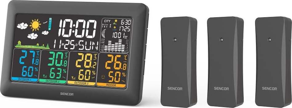Meteorologická stanice se 3 bezdrátovými senzorySENCOR SWS 6300Ikona předpovědi počasí (slunečno, mírně oblačno, oblačno, déšť, sněžení)Předpověď na 12 ~ 24 hodin založená na změně tlaku a teploty vzduchuMěření vnitřní teploty a vlhkosti s indikátorem komfortu a vývojeMěření venkovní teploty a vlhkosti s indikátorem vývojeRádiem řízené hodiny pomocí signálu DCF77 (možnost ručního nastavení)Hodnota barometrického tlakuSloupcový graf pro změny tlaku (-1, -2, -3, -6, -12 hodin)Digitální čas, Datum a den v týdnuČas východu / západu slunceZobrazení měsíční fázeIndikace úrovně komfortu (3 úrovní)Max. / Min. záznamy v paměti (24h)Budík s funkcí opakovaného buzeníRozsah měření vnitřní teploty: -20 až +50°CRozsah měření venkovní teploty: -40°C až +60°CRozsah měření vlhkosti 1% až 99% RV12 / 24 hodinový formátZobrazení stupnice teploty °C / °F5 úrovně jasu displejeUmístění na stůlIndikátory vybitých baterií (pro hlavní jednotku i venkovní senzor)Možnost připojení až tří senzorů3 senzory součástí balení ( SWS TH6300 )Přenos na vzdálenost - až do vzdálenosti 80 m ( v otevřeném prostoru )Frekvence vysílání senzoru: 433,92 MHzNapájecí adaptér hlavní jednotky: DC 5 V / 1200 mA (součást příslušenství), Spotřeba: 6 WZáložní baterie hlavní jednotky: 3 x 1,5 V typ AA (baterie nejsou součástí balení)Napájení senzoru: 2 x 1,5 V typ AA ( baterie nejsou součástí balení )Rozměry hlavní jednotky: ( š / v / h ) 200 x 129 x 30 mmHmotnost hlavní jednotky: 337 g