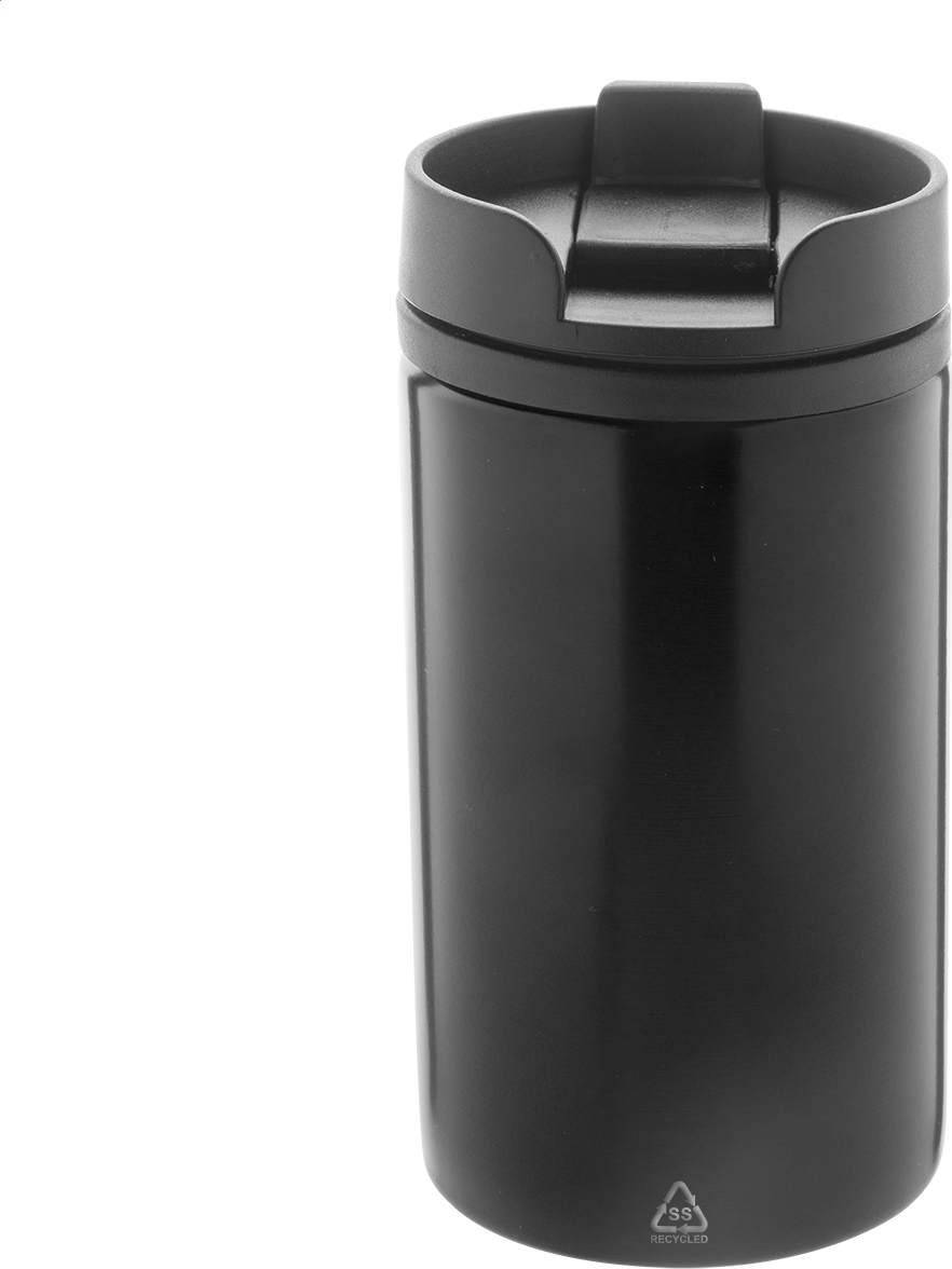 Dvoustěnný izolovaný termo hrnek z recyklované nerezové oceli s PP plastem uvnitř a víčkem na pití. 250 ml.