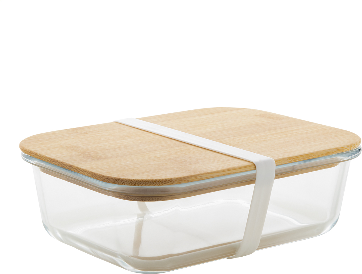 Skleněný box na jídlo s víkem z přírodního bambusu a silikonovým páskem, 800 ml.