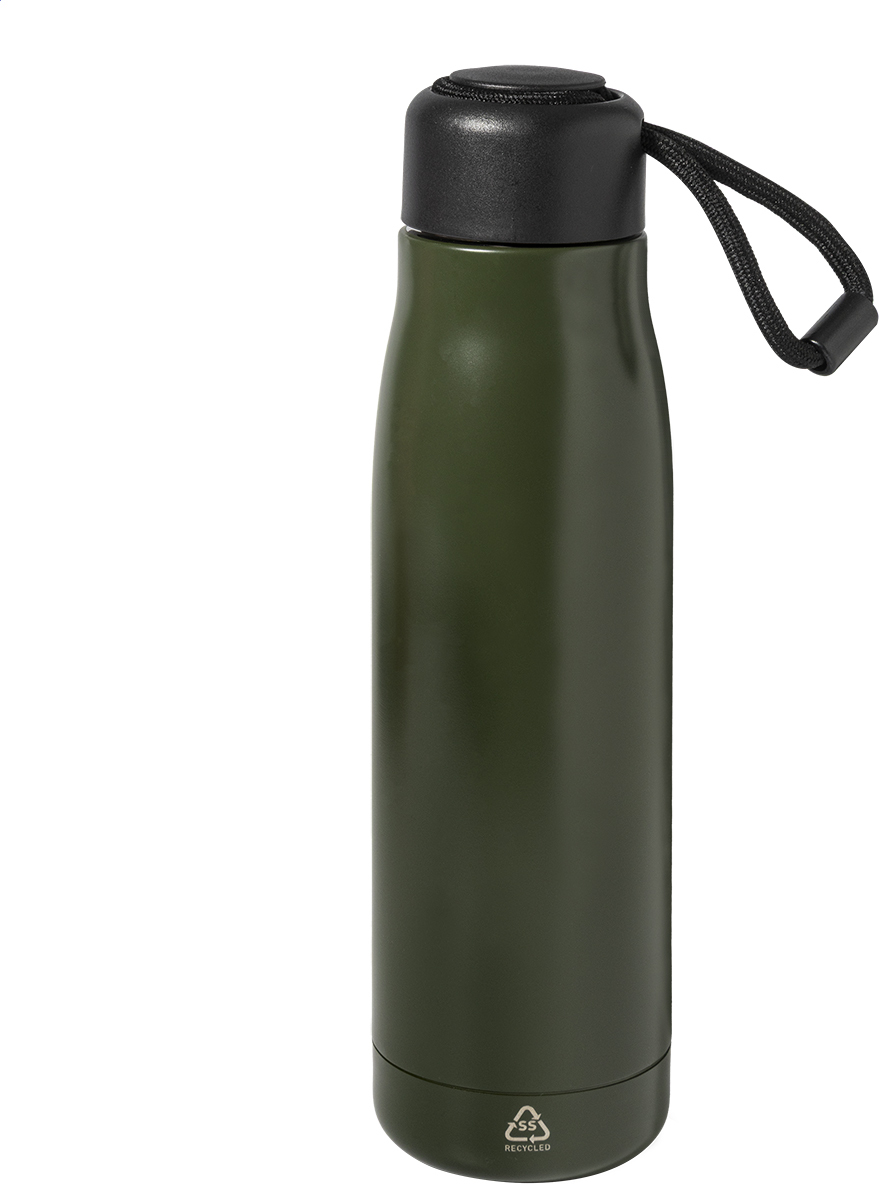 Dvoustěnná, vakuově izolovaná láhev z recyklované nerezové oceli s PP víčkem a integrovaným poutkem na nošení se šňůrkou. 500 ml.