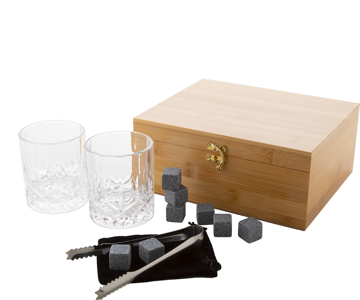 Luxusní whisky set v dárkové krabičce z bambusu. Obsahuje 2 sklenice na whisky (250 ml), 8 opakovaně použitelných kamenných kostek ledu s úložným pouzdrem a nerezové kleště.