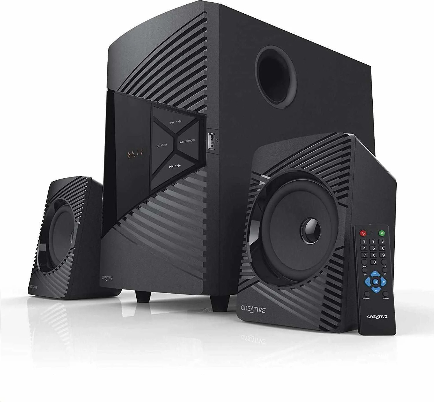 Vysoce výkonná reproduktorová soustava 2.1 s funkcí Bluetooth® a se subwooferem pro počítače a televizoryCreative SBS E2500 je vysoce výkonná reproduktorová soustava 2.1, která umožňuje poslech bohatého a výrazného zvuku prostřednictvím široké škály možností připojení.Sreamujte bezdrátově přes připojení Bluetooth, poslouchejte oblíbené rozhlasové kanály v pásmu FM nebo přehrávejte přímo z libovolného zařízení USB! Kabelové připojení umožňuje 3,5 mm zdířka vstupu AUX. Nastavení přehrávání hudby a zvuku je pohodlně přístupné přímo na reproduktorech a různé předvolby ekvalizéru na bezdrátovém infračerveném ovladači, který je standardně ve výbavě.Creative SBS E2500 je ideální volba pro vaše potřeby hudební zábavy.Reproduktorová soustava 2.1 s měniči se vzdáleným zvukovým polemVysoce výkonná reproduktorová soustava 2.1 s funkcí Bluetooth, která vydává bohatý plný zvuk, s efektivním výkonem 30 W a špičkovým výkonem až 60 W. Reproduktory jsou vybaveny vyladěnými měniči se vzdáleným zvukovým polem pro působivý poslech.Subwoofer z MDF se spodním vyzařovánímSubwoofer z MDF se spodním vyzařováním, který obohacuje zvuk reprodukcí ohromujících basů - ideální pro filmy a živé hraní!Možnosti připojeníFM RádioPoslouchejte oblíbené rozhlasové stanice nebo diskžokeje ze zabudovaného analogového FM tuneru s automatickým laděním stanic. Navíc si systém pro ještě větší pohodlí pamatuje poslední stanici FM, kterou jste si naladili.Bluetooth 5.0S pomocí nejnovější technologie Bluetooth 5.0 můžete přenášet zvuk s vysokou kvalitou bez nepraktických kabelů.Přehrávání souborů MP3 z USBNechte se unést rytmem oblíbeních písniček z USB flash disku přes vestavěný MP3 přehrávač s funkcí Plug and Play.Vstup AUX3,5 mm konektor vstupu AUX pro kabelové analogové připojení k počítač, televizoru a podobně.Praktická ovládací tlačítkaTlačítka na přední straně systému poskytují snadný přístup k ovládání přehrávání hudby a hlasitosti.Dálkový ovladač s několika předvolbami ekvalizéruPro ještě větší pohodlí dodáváme infračervený dálkový ovladač, abyste mohli upravovat nastavení zvuku z reproduktorů, hlasitost a přehrávání hudby bezdrátově. Na dálkovém ovladači si také můžete vybírat různé předvolby ekvalizéru5 vhodné pro hudební žánry, které posloucháte, nebo pro momentální náladu.Konfigurace reproduktorů Systém 2.1, Reproduktory počítačeTyp konektoru Vstup USB, Bluetooth®, Vstup AuxProvozní teplota 0°C až 45°CDoporučené použití Práce a studiumRozměry (D x Š x V) 155 x 270 x 264 mm, Levý reproduktor: 90 x 75 x 130 mm, Pravý satelit: 90 x 75 x 130 mmHmotnost Levý: 258 g, Pravý: 258 g, Subwoofer: 2.15 kgDélka kabelu (celková) Napájecí kabel: 1,2 m, Kabel s konektory 3,5 mm: 1,5mKonfigurace měničů 2 x 3” Ovladače, 1 x 5” Subwoofer DriverKmitočtová odezva 50–20,000 HzOdstup signálu od šumu (SNR) > 75 dBVýstupní výkon Výstup subwooferu: 15 W RMS, Celkový výkon systému: Až 30 W RMS, Satelitní reproduktory: 2× 7.5 W RMSBluetooth® Version 5.0Profily A2DP (Advanced Audio Distribution Profile), (AVRCP) Profil dálkového ovládání audia/videaProvozní frekvence 2402–2480 MHzBezdrátové kodeky SBCOvládání Hlasitost: AnoBarva ČernáPodporované Platformy Windows PC, Mac, Mobil (přes Bluetooth®)Obsah balení2 satelitní reproduktory (levý a pravý)1 subwoofer1 infračervený dálkový ovládač1 kabel s konektory 3,5 mm1 FM anténa1 stručná úvodní příručka