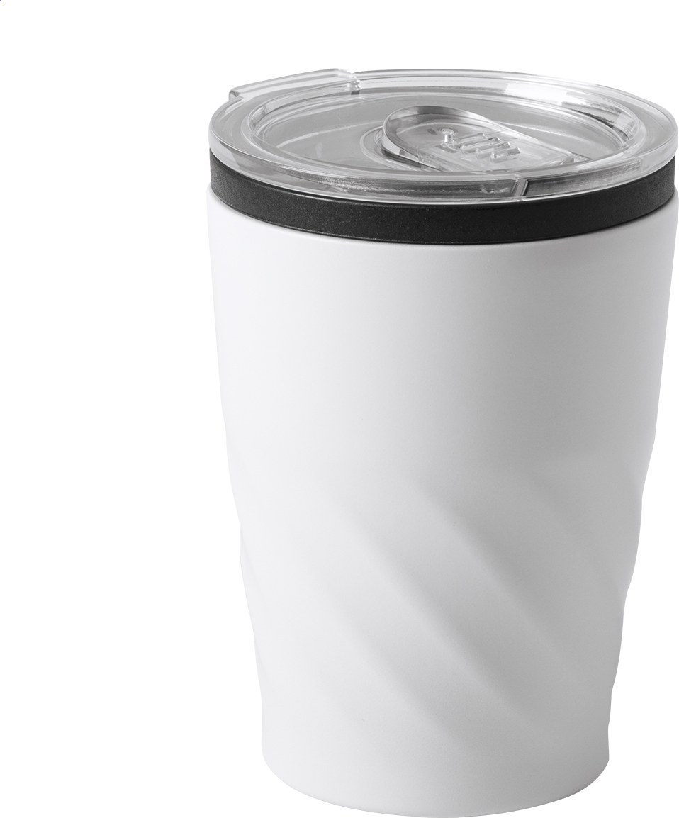 Nerezový, jednostěnný termo hrnek s plastovým víčkem na pití, 350 ml.