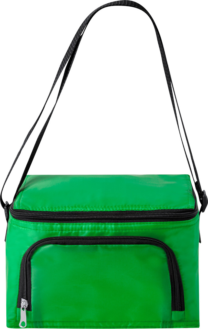 Polyesterová chladicí taška s přihrádkami na zip, hliníkovým polstrováním a ramenním popruhem. Pro 6 ks plechovek 0,33L. 210D polyester.