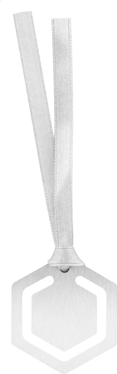 Záložka do knihy z nerez oceli se stříbrnou stužkou.