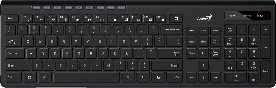 Genius SlimStar 7230 stylová multimediální klávesniceKlávesnice pro každodenní práci doma nebo v kanceláři. SlimStar 7230 má klávesy ve tvaru čokoládových tabulek pro pohodlné psaní.10 multimediálních a rychle přístupných klávesových zkratek usnadňuje procházení vašich oblíbených videí, přehrávání hudby a spouštění aplikací, jako je e-mail + samostatná klávesa Microsoft Copilot pro vyvolání AI asistenta.* ergonomický designTechnické parametryNumerická klávesnice: anoFunkční klávesy: 12 (8 audio, 4 internet)LED kontrolky: Num Lock, Caps Lock, Low BatteryPodsvícení: neOpora zápěstí: neRozhraní: USB přijímač 2,4GNapájení: 1x AABarva: černáRozměry: 440x141,3x30mmHmotnost: cca 453gKompatibilní softwarové platformy: Windows, Mac OSDoporučené požadavky na systém: volný port USB-A