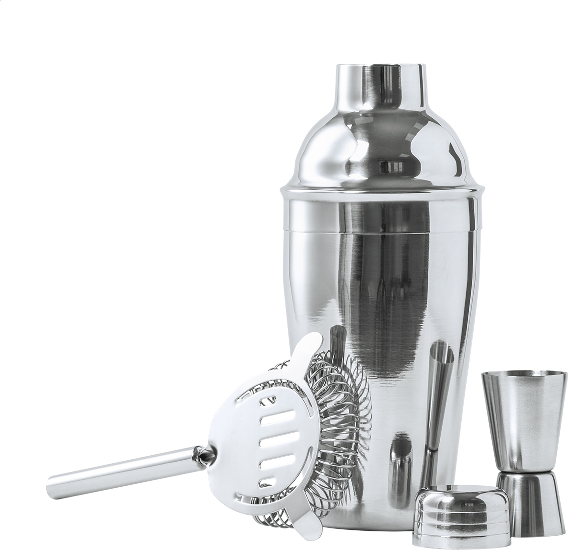 Nerezová koktejlová sada s 550 ml šejkrem, odměrkou a koktejlovým sítkem.