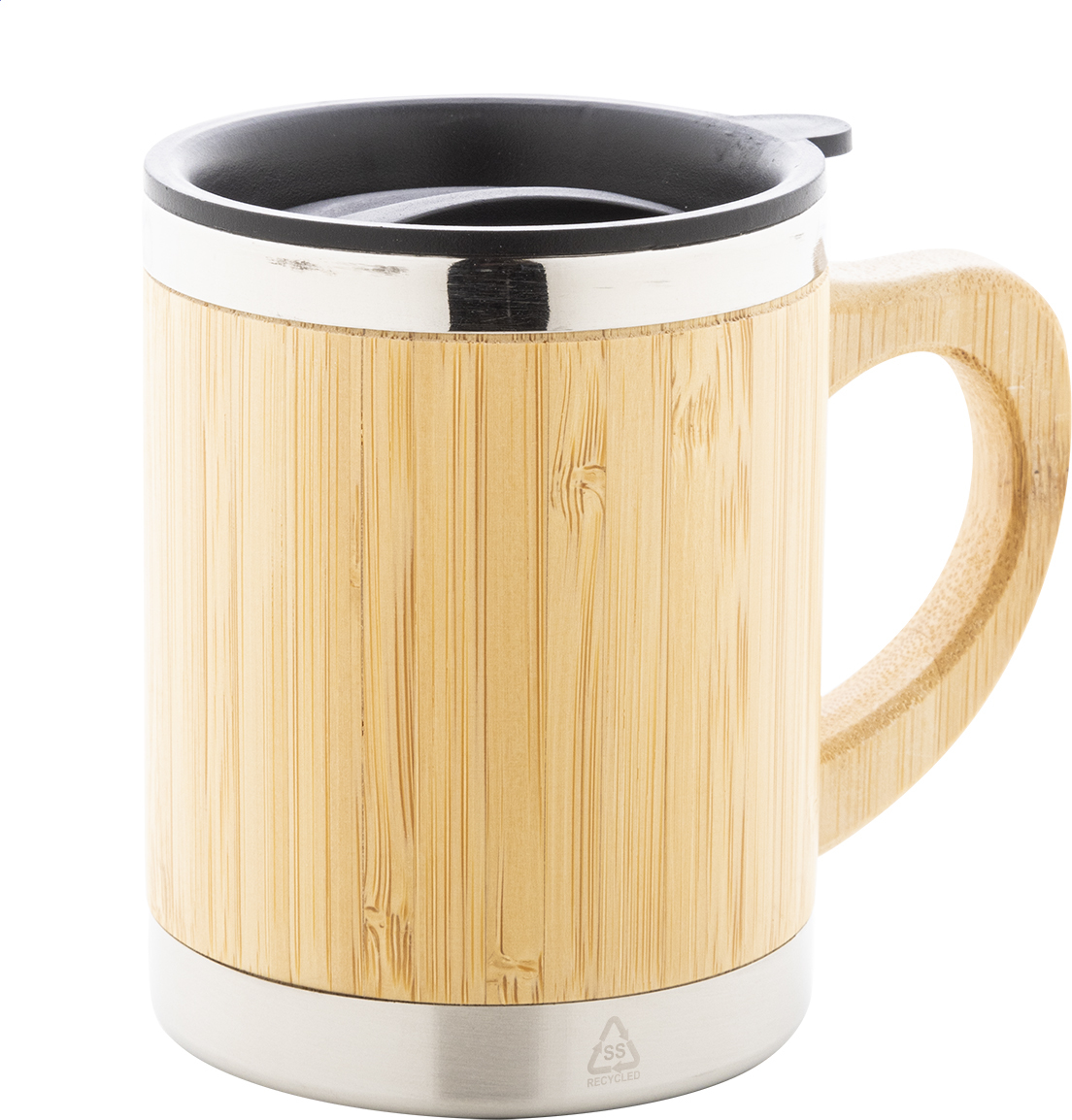 Bambusem potažený, dvoustěnný recyklovaný nerezový izolovaný termo hrnek s bambusovým uchem a PP víčkem na pití, 300 ml.