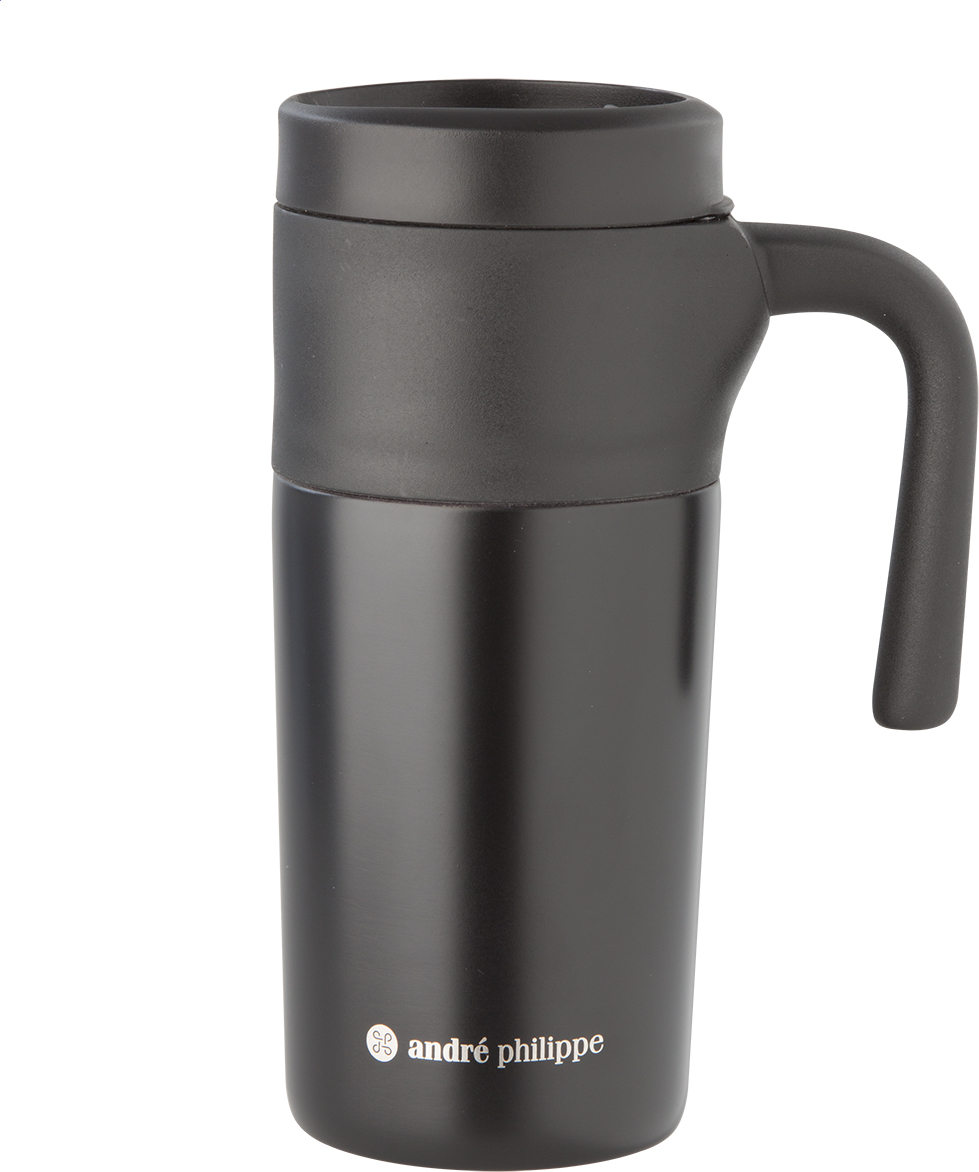 Nerezový jednostěnný termo hrnek s plastovým úchytem a víčkem 330 ml, v černé dárkové krabičce. Značkový produkt André Philippe.