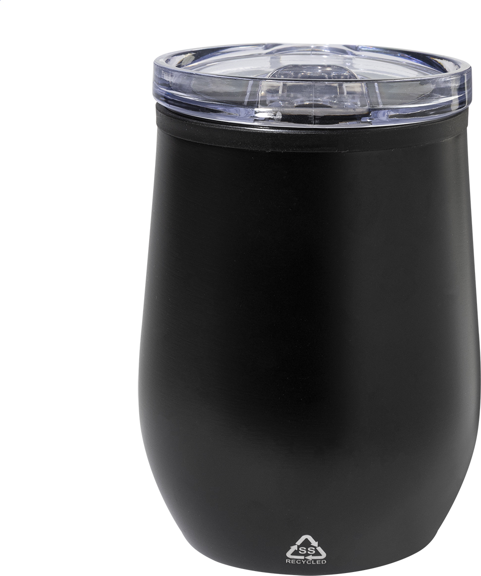 Dvoustěnný termo hrnek z recyklované nerezové oceli s vnitřní stranou z PP a víčkem z PS. 350 ml.