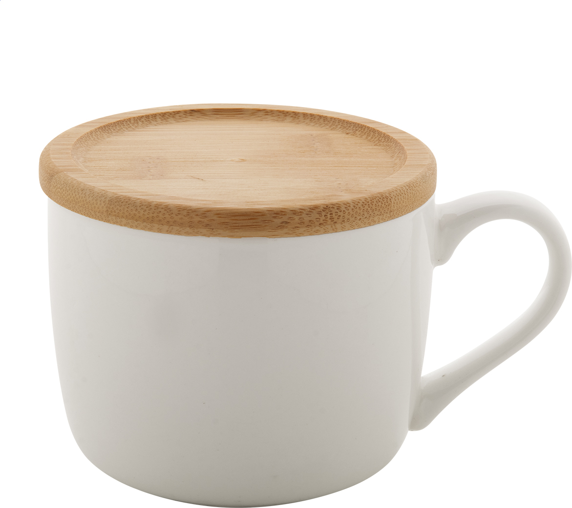 Vysoce kvalitní velký porcelánový hrnek v bílé barvě s bambusovým podtáckem, 400 ml. V dárkové krabičce.