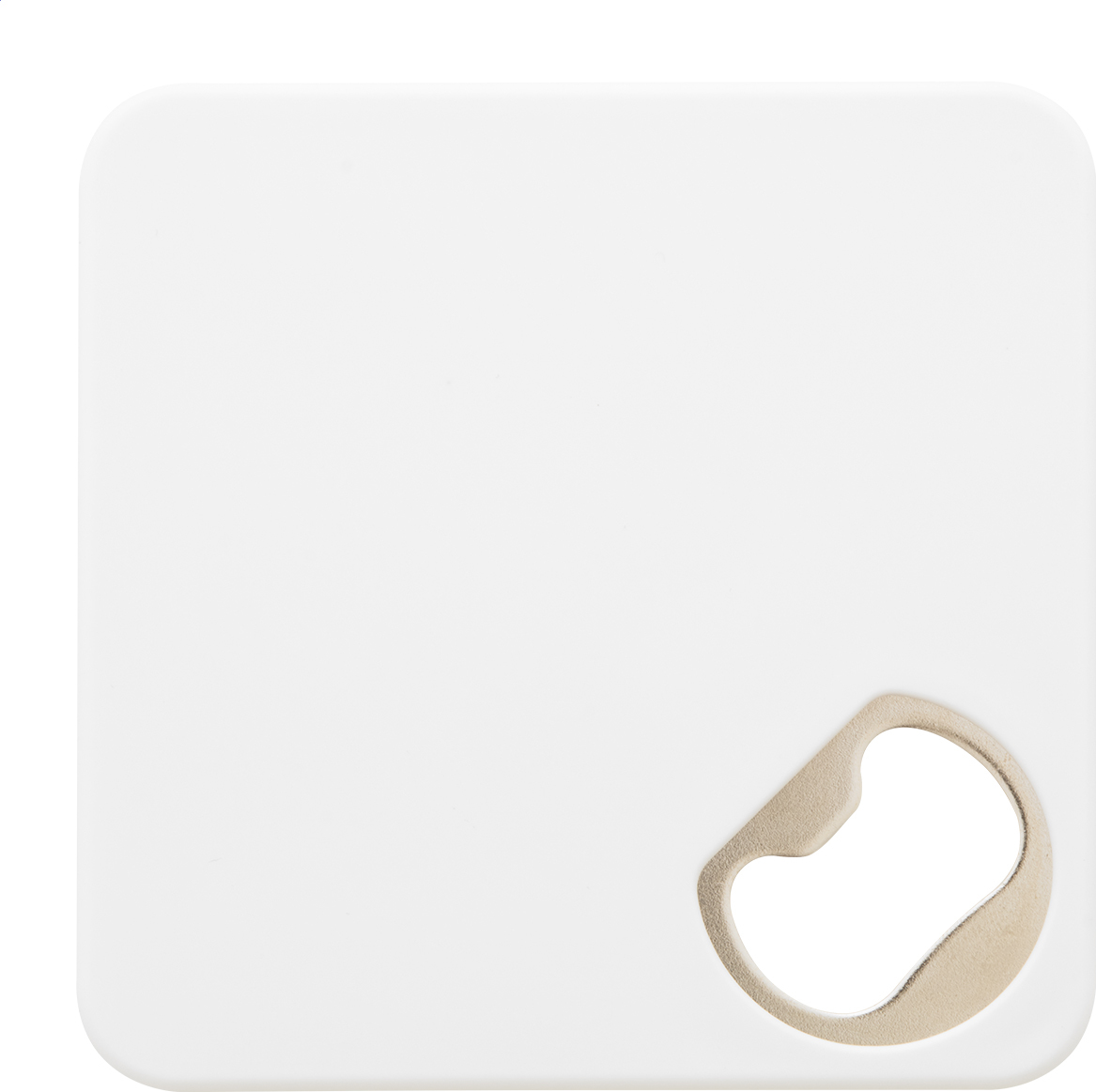 Plastový podtácek s kovovým otvírákem na láhve a protiskluzovým spodkem.