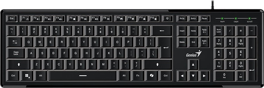 Genius SlimStar 820 - tenká podsvícená klávesnice* klávesa AI Copilot* bílé podsvícení s nastavitelným jasem - ostřejší, jasněšní a čitelnější klávesy* antighosting (19 kláves)Technické parametryPočet kláves: 105Numerická klávesnice: anoFunkční klávesy: 12LED kontrolky: Number Lock, Caps Lock, Scroll LockPodsvícení: LEDOpora zápěstí: neRozhraní: USBDélka kabelu: 1,8mBarva: černáRozměry: 446,4×133,31×23,25mmHmotnost: cca 470gKompatibilní softwarové platformy: Windows, Mac OSDoporučené požadavky na systém: volný port USB-AObsah balení:* kabelová klávesnice SlimStar 820* vícejazyčný průvodceZáruka: 2 roky