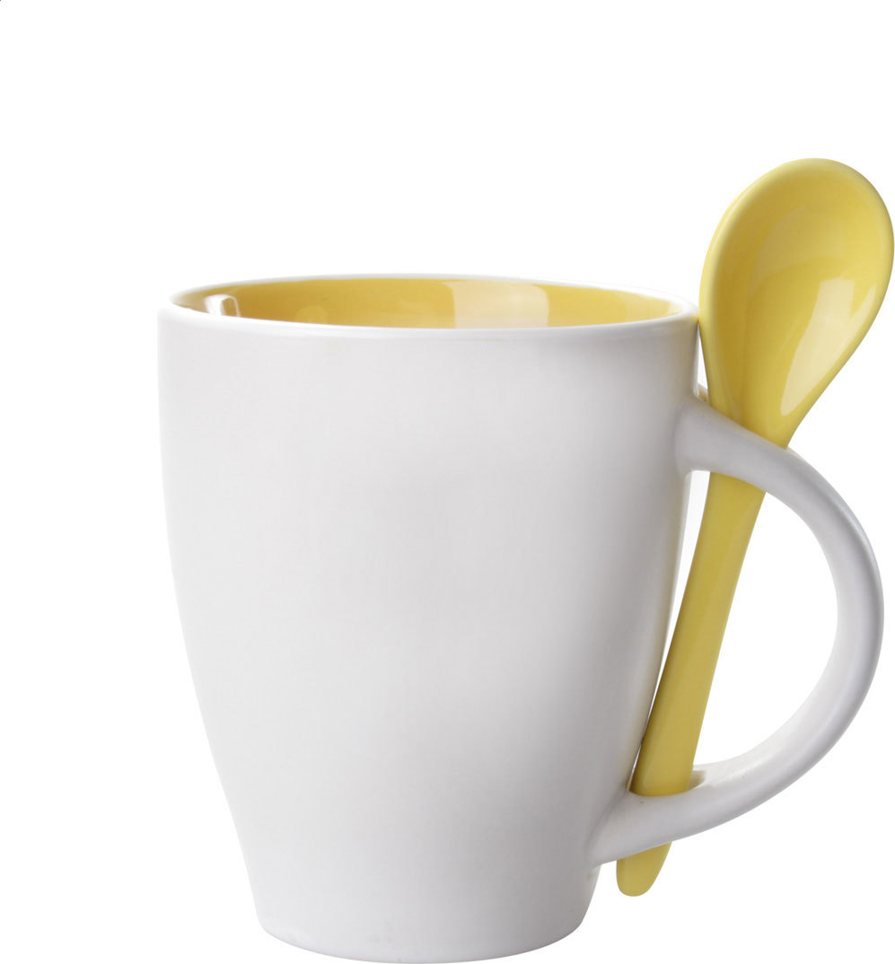 Bílý keramický hrnek s barevným vnitřkem a se stejně barevnou keramickou lžičkou, 300 ml. S hnědou dárkovou krabičkou.
