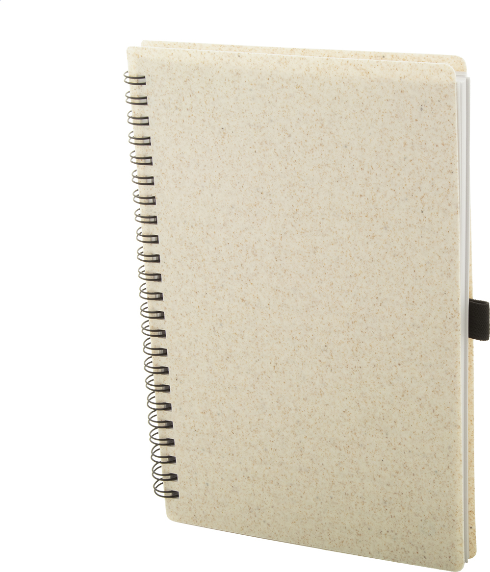 Ekologický spirálový blok A5 potažený plastem z pšeničné slámy se 70 linkovanými listy z recyklovaného papíru a držákem na pero.