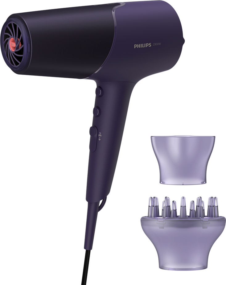 Vysoušeč vlasů Hair Dryer Series 5000, 2300W se šesti flexibilními nastaveními rychlosti a teploty pro dokonalou kontrolu. Senzor ThermoShield. Technologie Cool Shot na zafixování účesu po vysušení.Ionizační péče (8x více iontů) pro dokonale hladké a lesklé vlasy. Masážní objemový difuzér zvětšuje objem, vytváří kadeře a pružné účesy. Úzká koncovka pro koncentraci teplého vzduchu a dokonalou úpravu vlasů. Délka kabelu: 1,8 m. Háček pro pohodlné skladování.