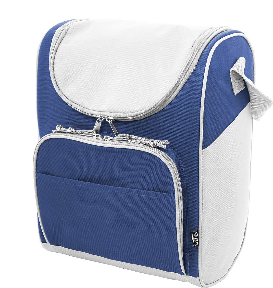 Chladicí taška RPET s hliníkovým polstrováním. Se 2 přihrádkami na zip, malou přední kapsou a nastavitelným ramenním popruhem. 600D RPET polyester s výrazným štítkem RPET.