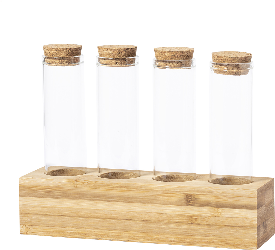 Sada 4 kusů skleněných kořenek z borosilikátového skla s víčky z přírodního korku a bambusovým stojánkem, 70 ml.