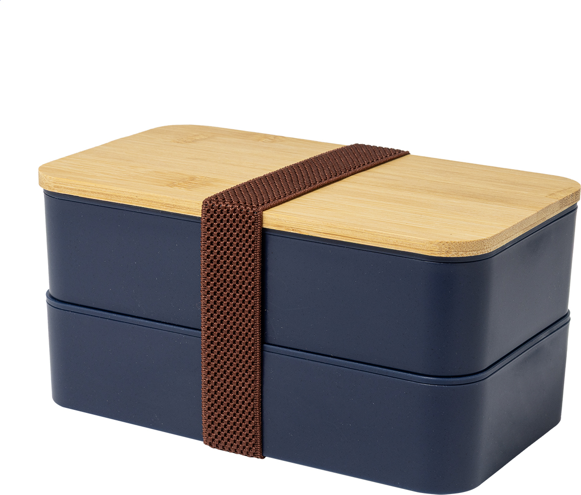 Box na jídlo z PP plastu se sadou příborů (vidlička, lžíce a nůž), bambusovým víkem a elastickým popruhem. Se 2 přihrádkami o objemu 700 ml.