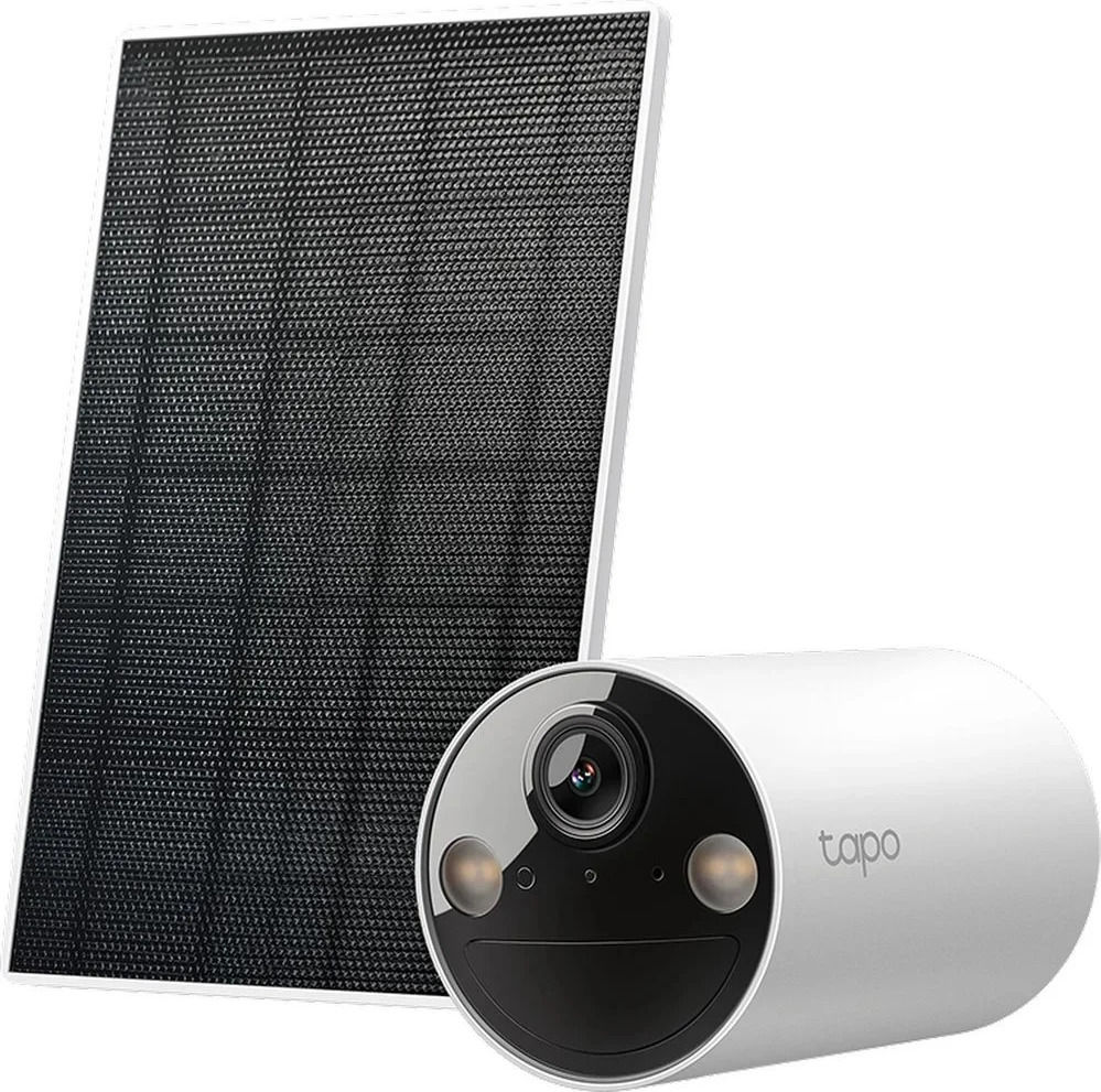 Solární sada kamery Tapo C410 + solární panel A201, 2K, Wi-Fi 2,4 GHz, nepřetržité napájení, AI detekce (pohyb/osoby), barevné noční vidění, obousměrný zvuk, alarm, IP65, Tapo, Google/Alexa