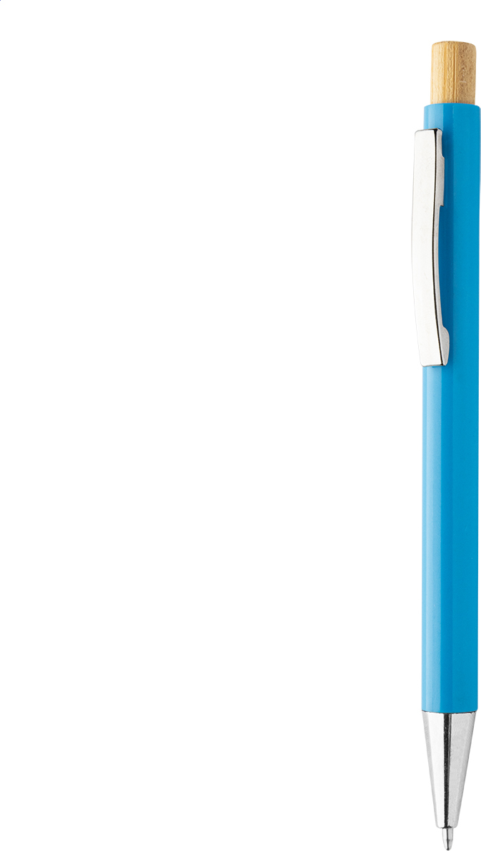 Kuličkové pero z recyklovaného ABS plastu s bambusovým tlačítkem a kovovým klipem. S modrou náplní.