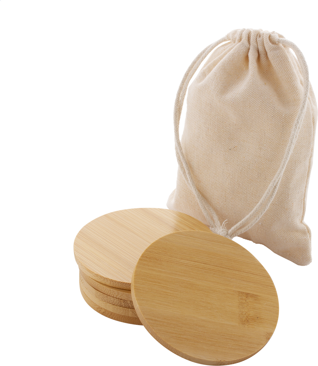 6dílná sada kulatých bambusových podtácků v bavlněném pytlíku se stahovací šňůrkou.