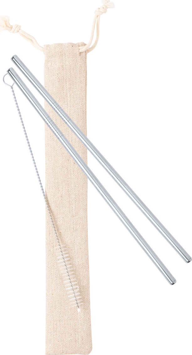 Sada 2 opakovaně použitelných nerezových brček na pití a čistící štěteček v bavlněném obalu.