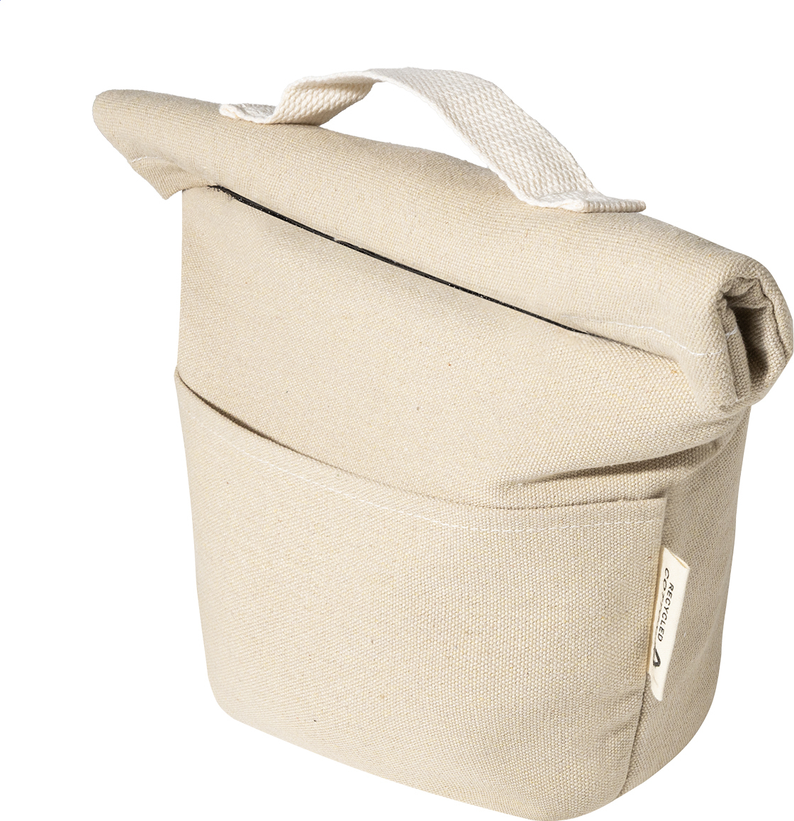 Chladicí taška z recyklovaného plátna s rolovacím vrškem, přední kapsou, hliníkovou výplní a zapínáním na suchý zip. 70 % recyklované bavlny a 30 % RPET polyesteru. S výrazným štítkem recyklované bavlny.