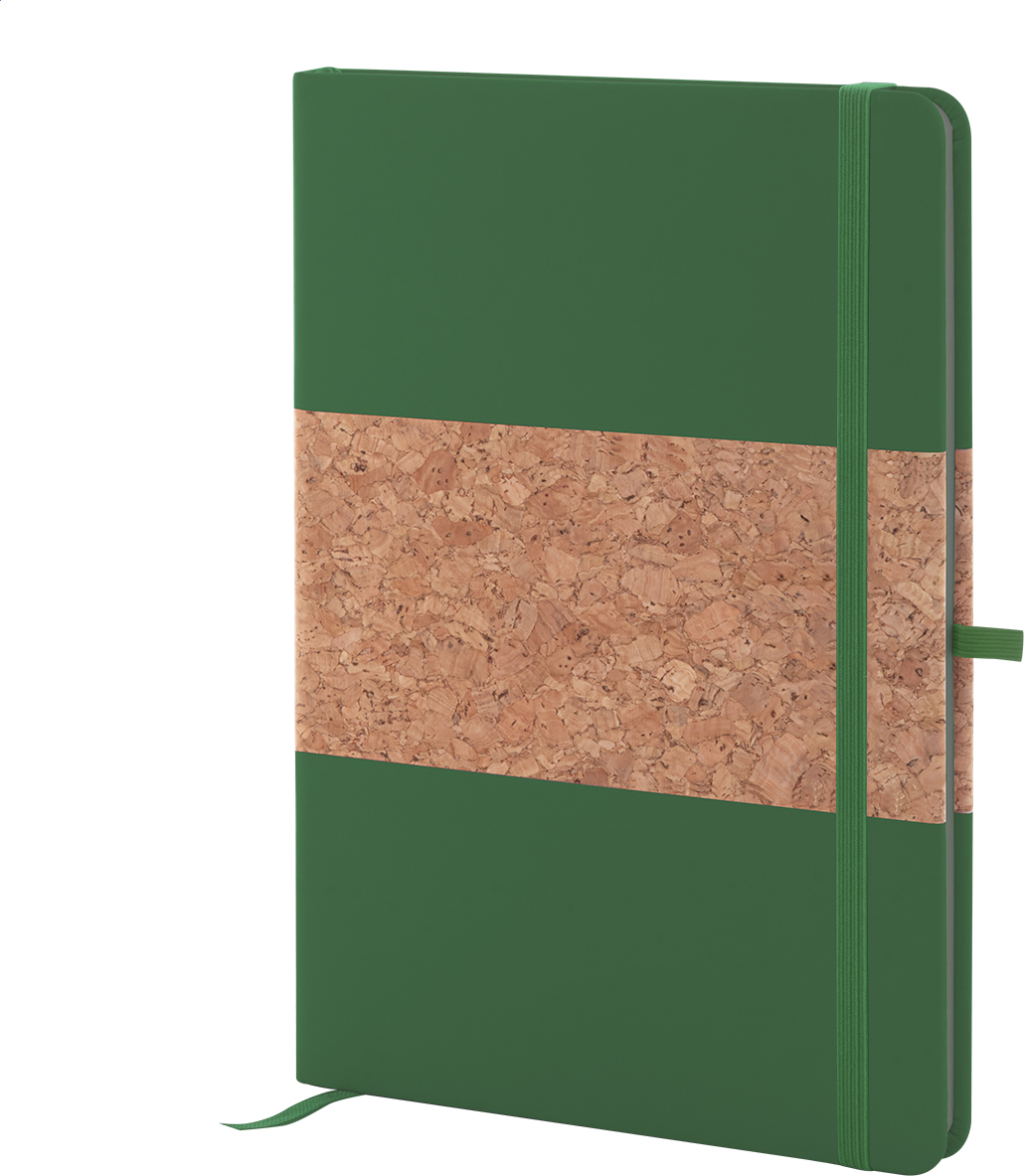 Blok A5 potažený přírodním korkem a recyklovanou PU kůží se záložkou v odpovídající barvě, gumičkou a držákem na pero. S 80 linkovanými listy z recyklovaného papíru.