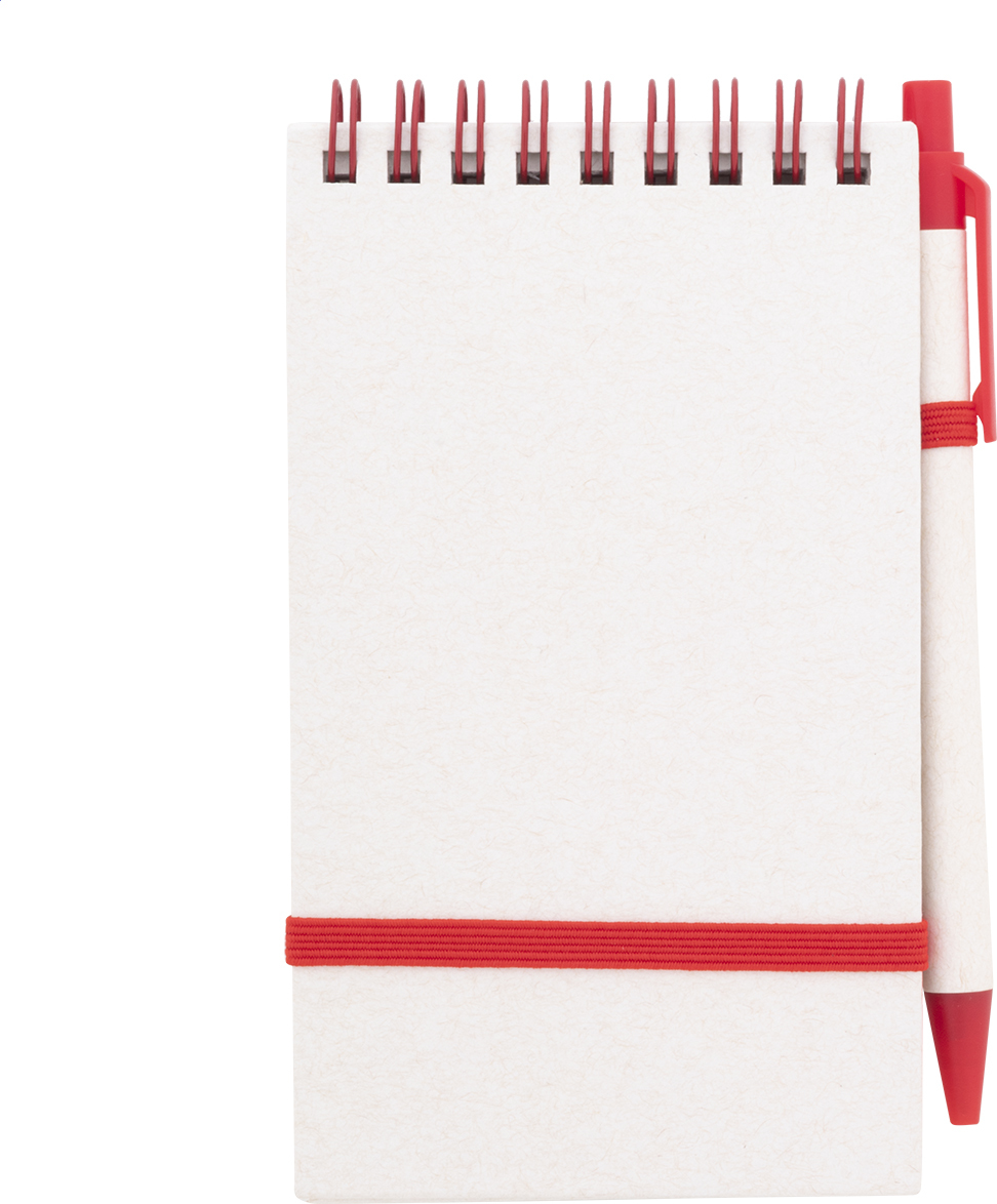 Spirálový blok A6 s deskami z recyklovaného z kartonu na mléko s pevnou vazbou a 70 linkovanými listy. Se spirálovými kroužky ve stejné barvě, gumičkou a poutkem na pero. Včetně recyklovaného kartonového papíru na mléko a recyklovaného ABS plastového kuličkového pera s modrou náplní.