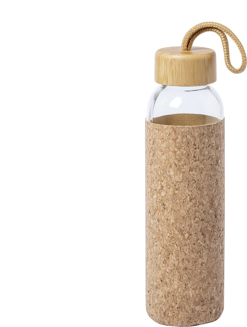 Skleněná láhev s pouzdrem z přírodního korku, bambusovým víčkem a popruhem na přenášení, 500 ml. Nevhodné pro sycené nápoje.