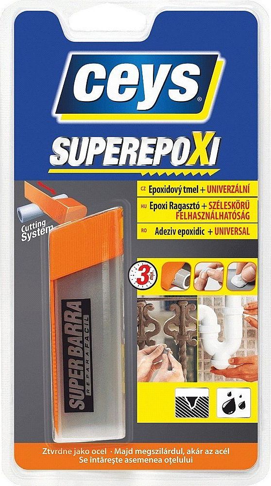 POPISTmelí, opravuje, obnovuje a lepí všechny typy materiálů.Je to velmi odolný lepicí tmel určený pro upevnění, utěsnění, vyplnění, vytvoření a obnovu řady materiálů a pro opravy v domácnosti.Tmel se velmi dobře tvaruje, ztuhne jako ocel a ve výsledku vytvoří mimořádně odolné povrchy.Po vytvrzení lze materiál brousit, vrtat, leštit, natírat a lakovat.VLASTNOSTIVysoce kvalitní provedení: lze brousit, vrtat, leštit, natírat a lakovat.Vysoká přilnavost na širokou škálu materiálů: keramika, sklo, sádra, železo, plast*.Vysoká pevnost: Po smíchání se neláme ani nedeformuje a umožňuje vytvoření požadovaného tvaru.Odolný vůči vysokým teplotám (až +120 °C)*Nevhodné pro: PE, PP a PTFE.APLIKACEPřipevňuje: dlaždičky, mozaiky, malé předměty.Opravuje: skříně, rámy, sokly, nábytek, lednice, hliníkové stropy, nádrže, formy.Vyplňuje: otvory matic a šroubů, praskliny a trhliny ve stěnách.Obnovuje: poškození na schodech, zábradlí, jakýkoli předmět na sanitárních a kanalizačních zařízeních.Tmelí: netěsnosti na potrubí a radiátorech (kov, měď, PVC), trhliny.MATERIÁLYKeramika, sklo, sádra, železo, plast, kov, dřevoNevhodné pro: PE, PP a PTFE.ZPŮSOB POUŽITÍSnadná aplikace: ODŘÍZNOUT, SMÍCHAT A APLIKOVAT1. Očistěte opravovaný povrch, odstraňte zbytky prachu a mastnost.2. K odříznutí tyčinky tmelu pro snadnou opravu použijte řezací víčko SUPER EPOXI a hmotu míchejte prsty, dokud nebude mít jednotnou barvu (během tohoto procesu se zvyšuje teplota tmelu).3. Aplikujte hmotu přitlačením na povrch a vyhlaďte pomocí víčka. Tmel se musí zcela integrovat do opravovaného povrchu.4. Produkt nechte působit po dobu 4 až 5 minut od aplikace.SKLADOVÁNÍPokud se výrobek uchovává v původním obalu za normálních skladovacích podmínek (při teplotě 15 - 20 °C) mimo dosah přímého slunečního záření, přesahuje jeho doba použitelnosti 2 roky.
