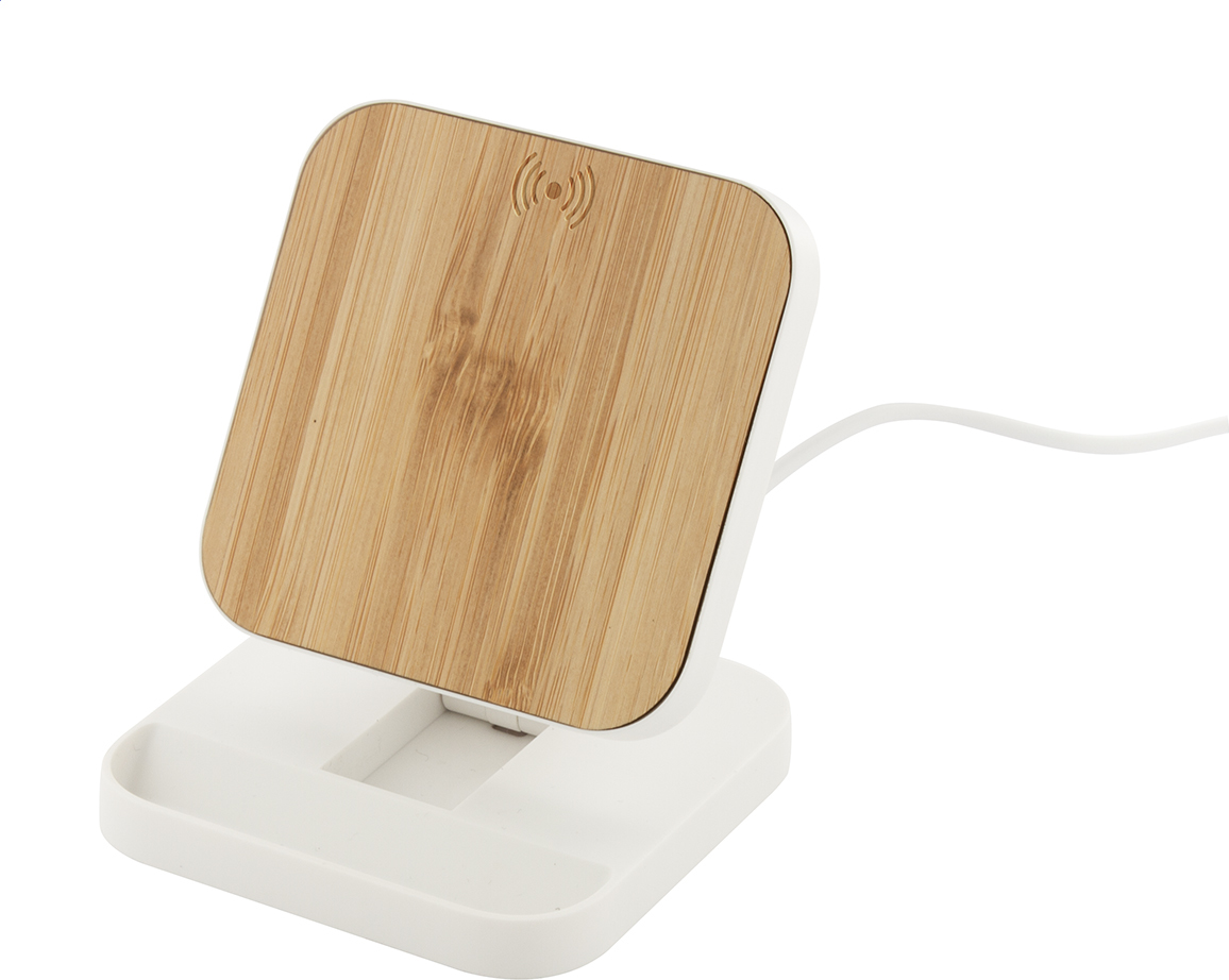 Recyklovaný stojánek na mobil z ABS s bambusovou vestavěnou bezdrátovou rychlonabíječkou (15W). Včetně USB nabíjecího kabelu.