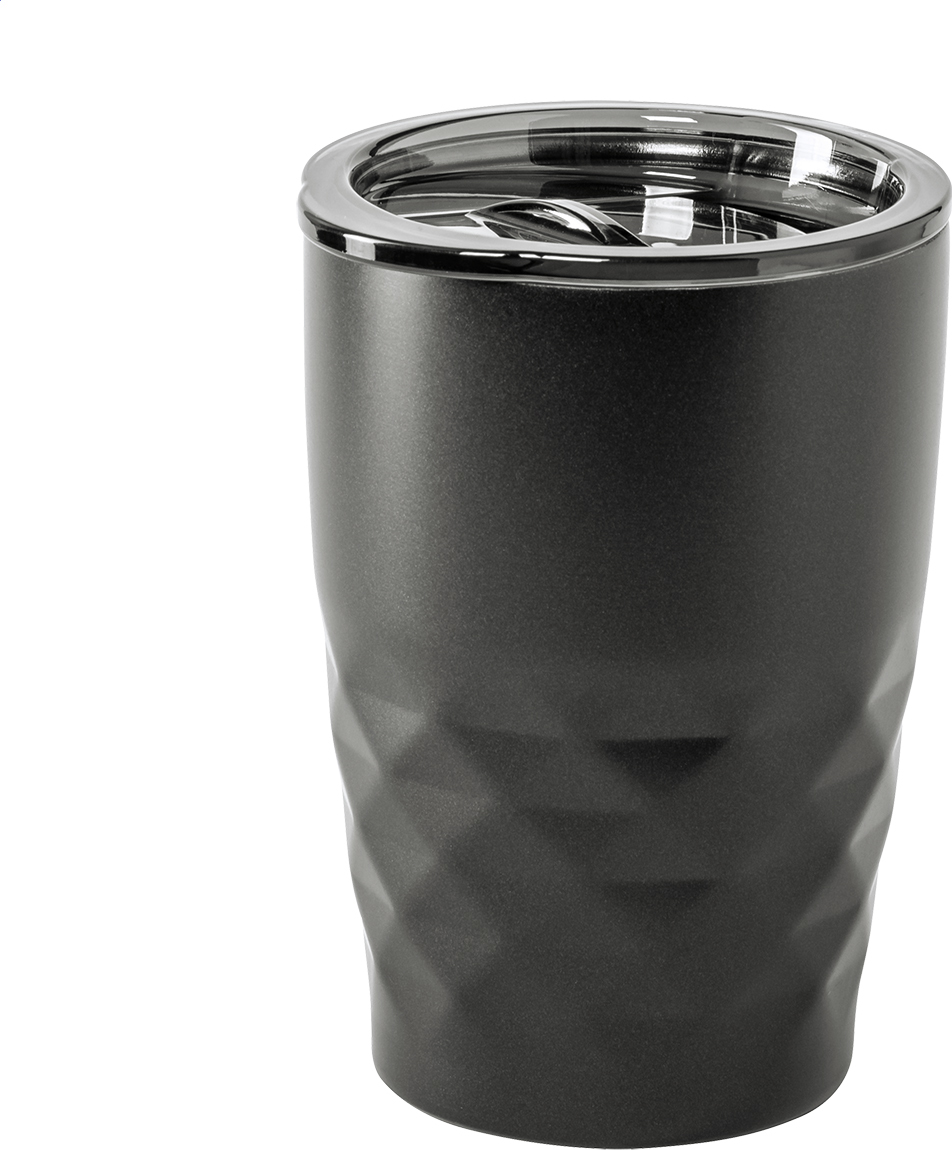 Dvoustěnný nerezový, měděný vakuově izolovaný termo hrnek s plastovým víčkem na pití. 350 ml. Měděná izolace udrží nápoje horké 12 a studené 24 hodin.