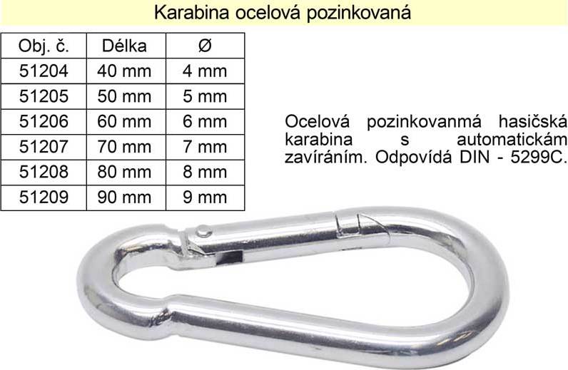 Ocelová pozinkovanmá hasičská karabina s automatickám zavíráním. • délka 80 mm• průměr 8 mm• DIN 5299C