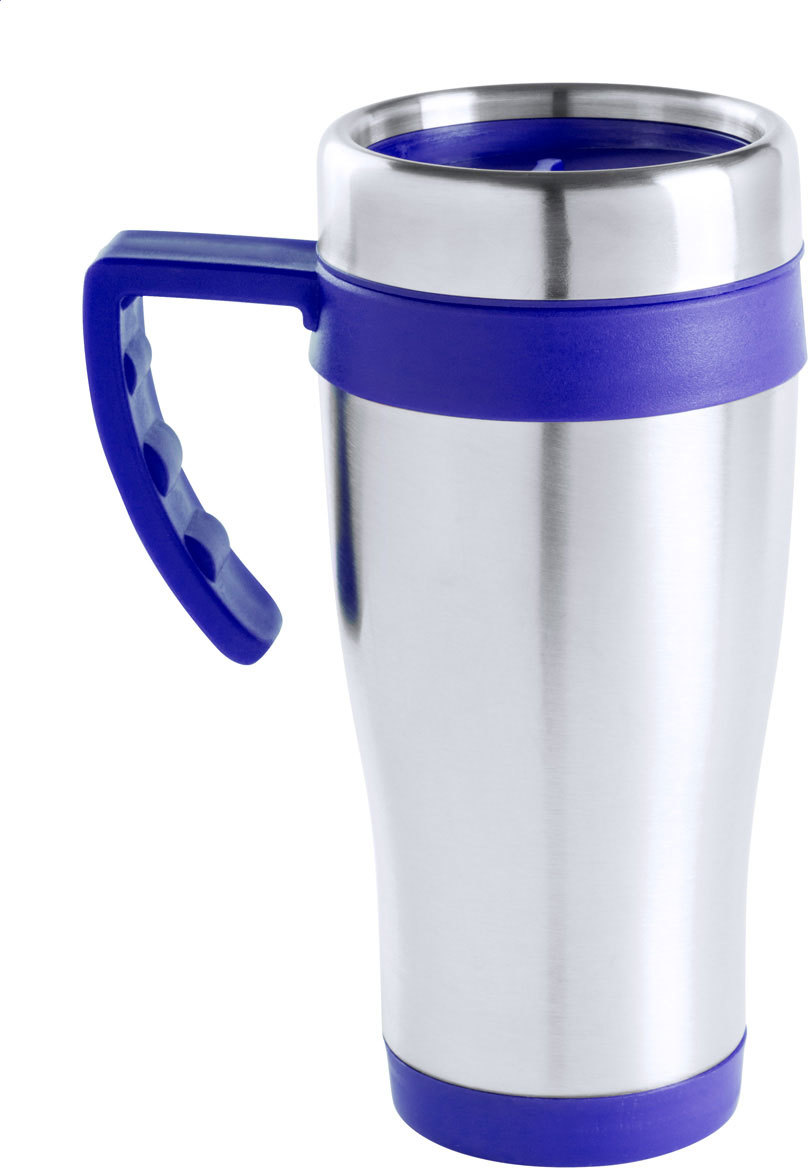 Nerezový termo hrnek z nerez oceli s barevnými plastovými částmi a uchem, 450 ml. V dárkové krabičce.