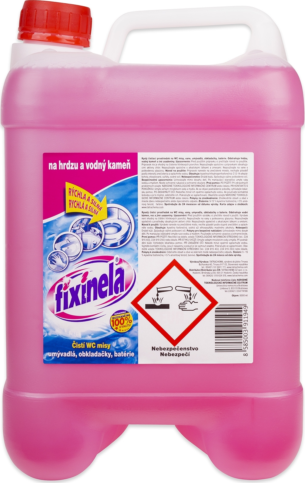 Účinně čistí a likviduje bakterie, rozpouští vodní a močový kámen, odstraňuje rez a další usazeniny. Fixinela má vysoký čistící účinek, lehce a rychle uvolňuje špínu a usazeniny z povrchu. Upozornění: Před použitím výrobku si přečtěte návod k použití. Výrobek není vhodný na čištění hliníkových povrchů. Nepoužívejte společně s prostředky obsahujícími aktivní chlór. Nepoužívejte společně s alkalickými látkami a směsmi. Nepoužívejte na vany s poškozenou glazurou. Návod k použití: Výrobek nastříkejte na znečištěné místo, nechte působit podle stupně znečištění a opláchněte vodou. Obsahuje: kyselina fosforečná, sodná sůl ethoxysulfátu mastného alkoholu.