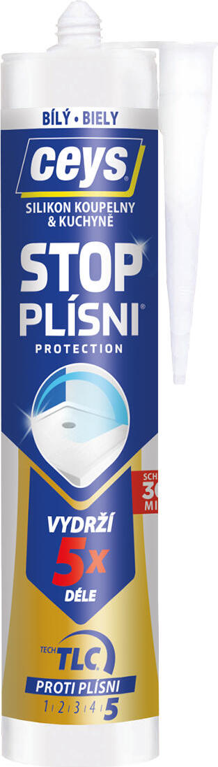 POPISSTOP PLÍSNI, STOP ČERNÝM SPÁRÁM! Čisté a bílé spáry natrvalo.Špičkový silikon pro koupelny a kuchyně, unikátní díky kombinaci dvou jedinečných vlastností:Technologie TLC díky postupnému uvolňování fungicidu zabraňuje, aby se plíseň a nečistoty usazovaly na silikonu, díky čemuž silikon nečerná a zůstává čistý a bez plísně 5krát déle než běžný silikon pro kuchyně a koupelny.Extra silná úroveň odolnosti proti plísni.Schne pouhých 30 minut, můžete se tedy sprchovat, aniž byste čekali celých 24 hodin.VLASTNOSTIMaximální odolnost proti plísnímSuchý do 30 minutVysoká přilnavost100 % vodotěsnýNelze jej natíratAPLIKACEUtěsňování sprch, van, umyvadel, dřezů, záchodů, bidetů, sklokeramických sporáků, pracovníchdesekVlhké prostory jako sklepy, tělocvičny, lázně, skleněné dveřeUtěsnění oken a veškerých prvků kováníMATERIÁLYKachličky, granit, kamenina, keramika, porcelán, Silestone®, Corian ®, sklo, hliník, dřevo,konglomerát, polyesterová pryskyřice. Není určeno na zrcadlaNení určeno na mramor, zrcadla, polyethylen, polypropylen, PTFE, akvária, nepoužívat při kontaktus potravinamiZPŮSOB POUŽITÍPřed nanesením:1. ODSTRAŇTE důkladně předchozí silikon, protože silikon na silikon nelepí.2. OČISTĚTE utěsňovaný povrch: důkladně očistěte a odstraňte plíseň a nečistoty od základu.3. Naneste malířskou pásku kolem spáry a ponechte volnou pouze mezeru, do které má být silikon aplikován4. Uřízněte kanylu kartuše šikmo, aby byla aplikace snadnější.Po aplikaci:5. UHLAĎTE proužek silikonu namydleným prstem nebo špachtlí.6. Po aplikaci silikonu odstraňte malířskou pásku.SKLADOVÁNÍUchovávejte v suchu a chladnu za teplot 5 - 30 °C.Doba použitelnosti při skladování v původním balení je 18 měsíců.