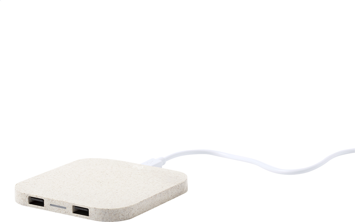 Bezdrátová nabíječka z ekologického plastu z pšeničné slámy se 2 porty USB. Maximální výstup 2100 mA. Včetně kabelu USB.
