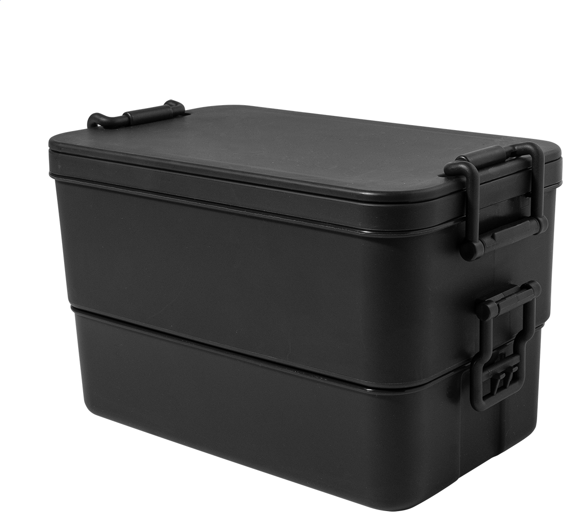 Box na jídlo z PP plastu se sadou příborů (vidlička, lžíce a nůž), zapínáním na přezku a 2 přihrádkami (1000 ml a 800 ml). Stohovatelný design pro kompaktní skladování.