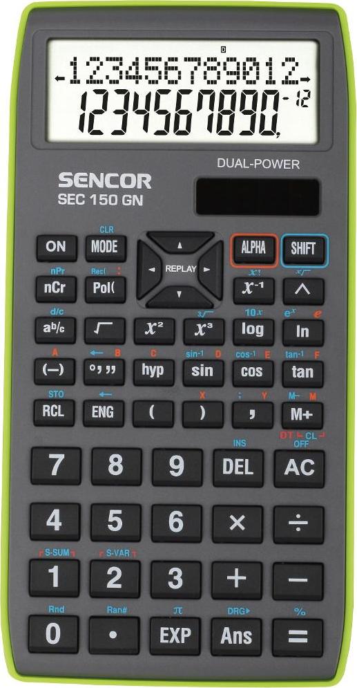 Školní kalkulačka240 vědeckých funkcíDvouřádkový LCD displejZobrazení 12 alfanumerických znaků a 10+2 čísliceFunkce procházení výpočtuVýpočty se zlomkyRegresní výpočty, variace, kombinaceGoniometrické a hyperbolické funkceLogaritmické a exponenciální funkcePřevody souřadnic a úhlůMocniny a odmocninyStatistické výpočtyZávorky a nezávislá paměťBinární, oktální, hexadecimální výpočtyAutomatické vypnutíOchranný nasouvací krytDuální napájení (1xLR43)Rozměry: 150x80x15mm (dxšxv)Hmotnost: 90 gZelený zadní krytDostupné v 2 barevných kombinacích