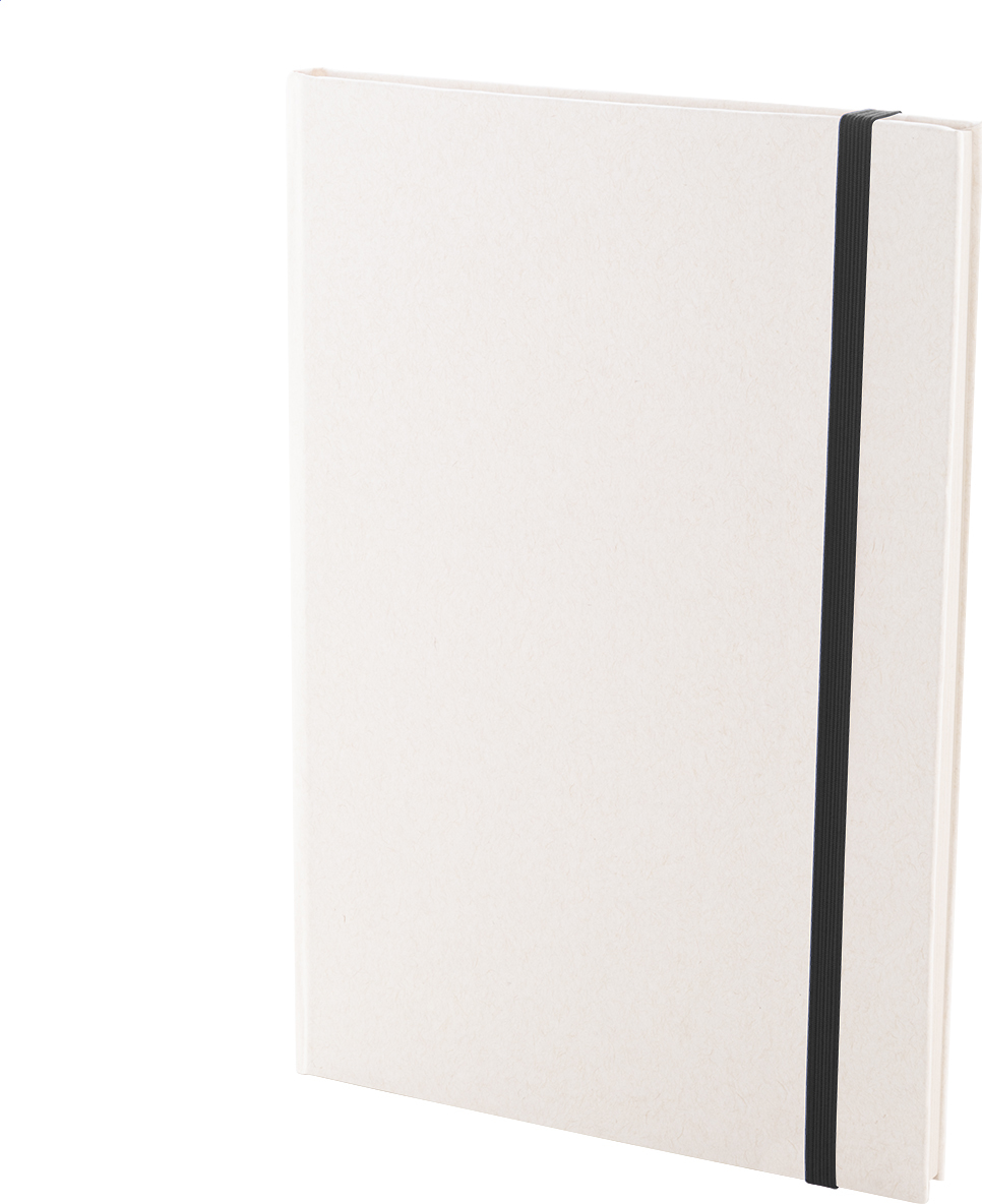 Blok A5 z kartonu z recyklovaného mléka s pevnou vazbou, 80 linkovanými listy a elastickým páskem v odpovídající barvě.