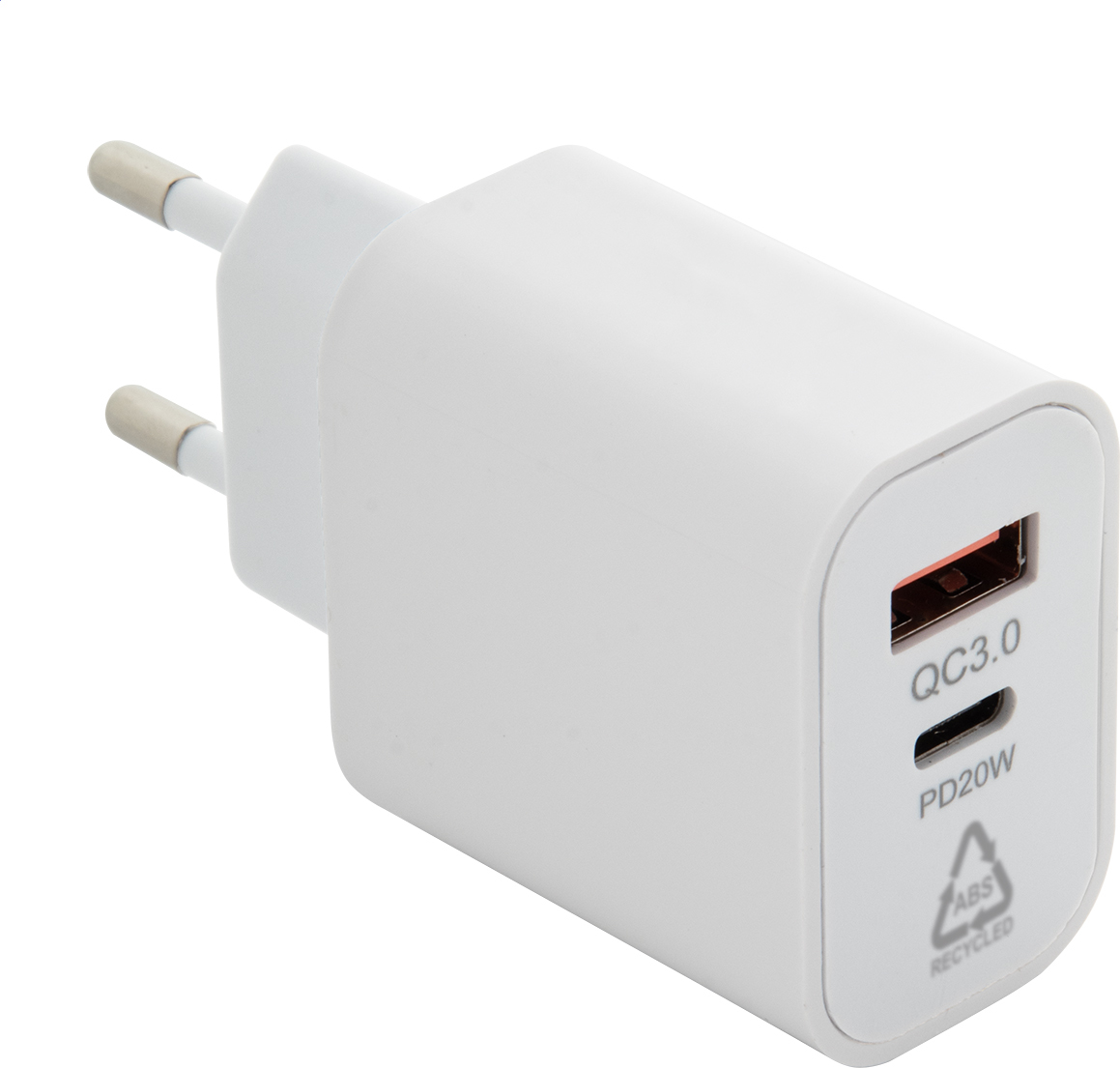 Recyklovaná ABS rychlonabíjecí USB nástěnná nabíječka s 1 USB a 1 USB-C portem. Podporuje technologii rychlého nabíjení (PD20W / QC3.0). S 2-pólovou evropskou zástrčkou.