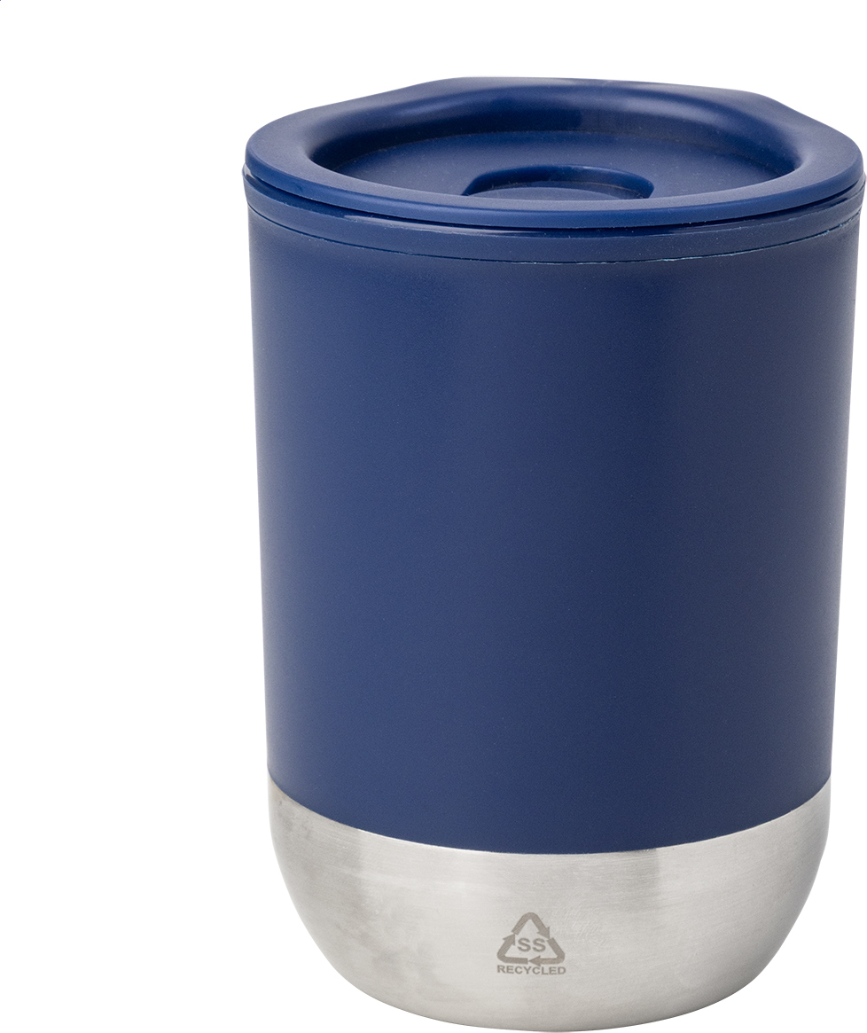 Dvoustěnný termo hrnek s PP plastovou izolací se dnem z recyklované nerezové oceli a víčkem na pití. 300 ml.