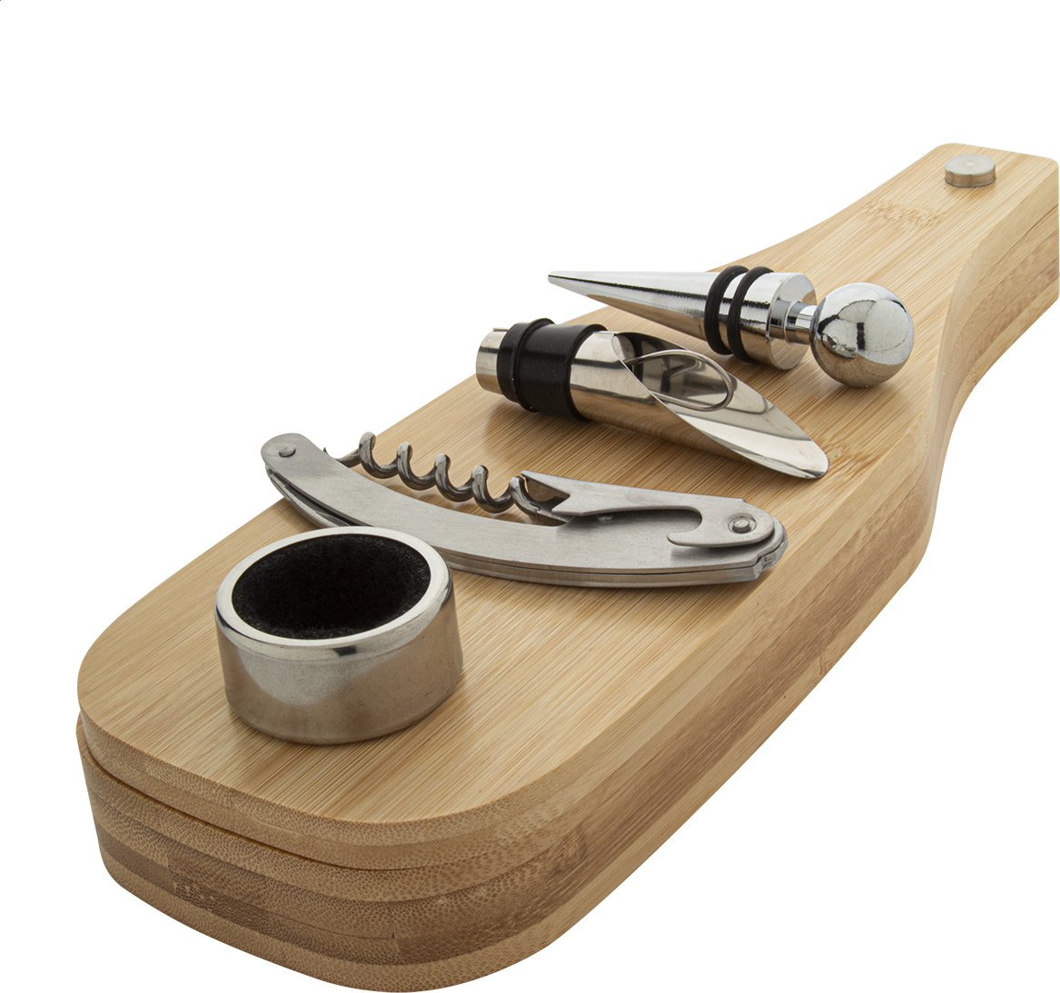 4 ks na víno z nerezové oceli v bambusové krabičce ve tvaru láhve. Včetně vývrtky, zátky, kroužku a nálevky.