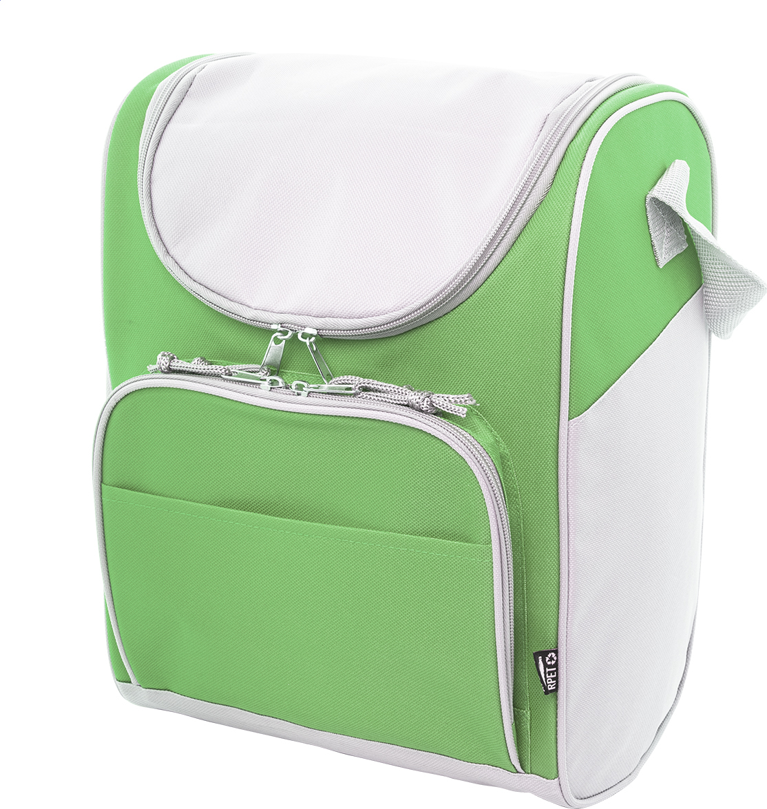 Chladicí taška RPET s hliníkovým polstrováním. Se 2 přihrádkami na zip, malou přední kapsou a nastavitelným ramenním popruhem. 600D RPET polyester s výrazným štítkem RPET.